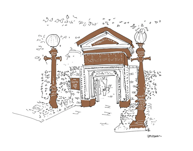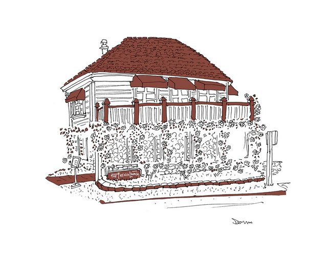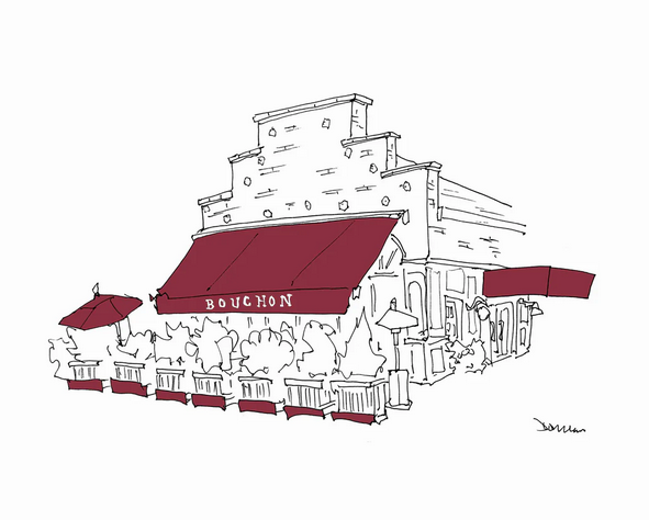 Former New Yorker editor and self-taught artist John Donahue, who has famously sketched all the restaurants of Paris, New York and London in distinctive hand-drawn style, now turns his pen to capture Napa Valley’s most memorable eating establishments. Donohue draws in ink and from life, meaning he stands in front of a place and makes no corrections. He finishes all drawings in his signature one-color style, often embellished with one distinctive accent color taken from an awning or design element of the restaurant, and sells signed, limited edition prints. Sales of his works have often benefited restaurant workers and other charities.
